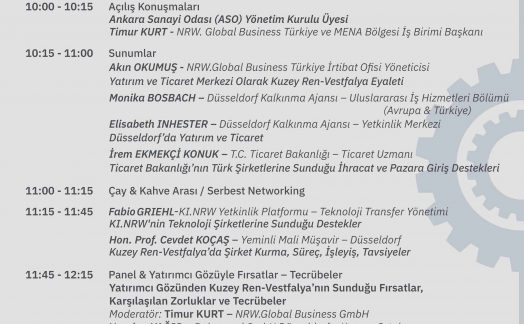 Sayın Katılımcımız; Ankara Sanayi Odası (ASO) ve Kuzey Ren-Vestfalya Eyaleti resmi dış ticaret ve yatırım destek ajansı NRW. Global Business iş birliği ile 21 Ekim 2025 Salı günü ASO Zafer Çağlayan Meclis Salonu’nda ‘Türk Dış Yatırımlarının Almanya’daki Merkezi Kuzey Ren-Vestfalya Eyaleti (NRW) – Düsseldorf’ta Yatırım ve Ticaret” etkinliği düzenlenecektir. Etkinlikte, Kuzey Ren-Vestfalya Eyaleti’nde yatırım olanaklarına, […]