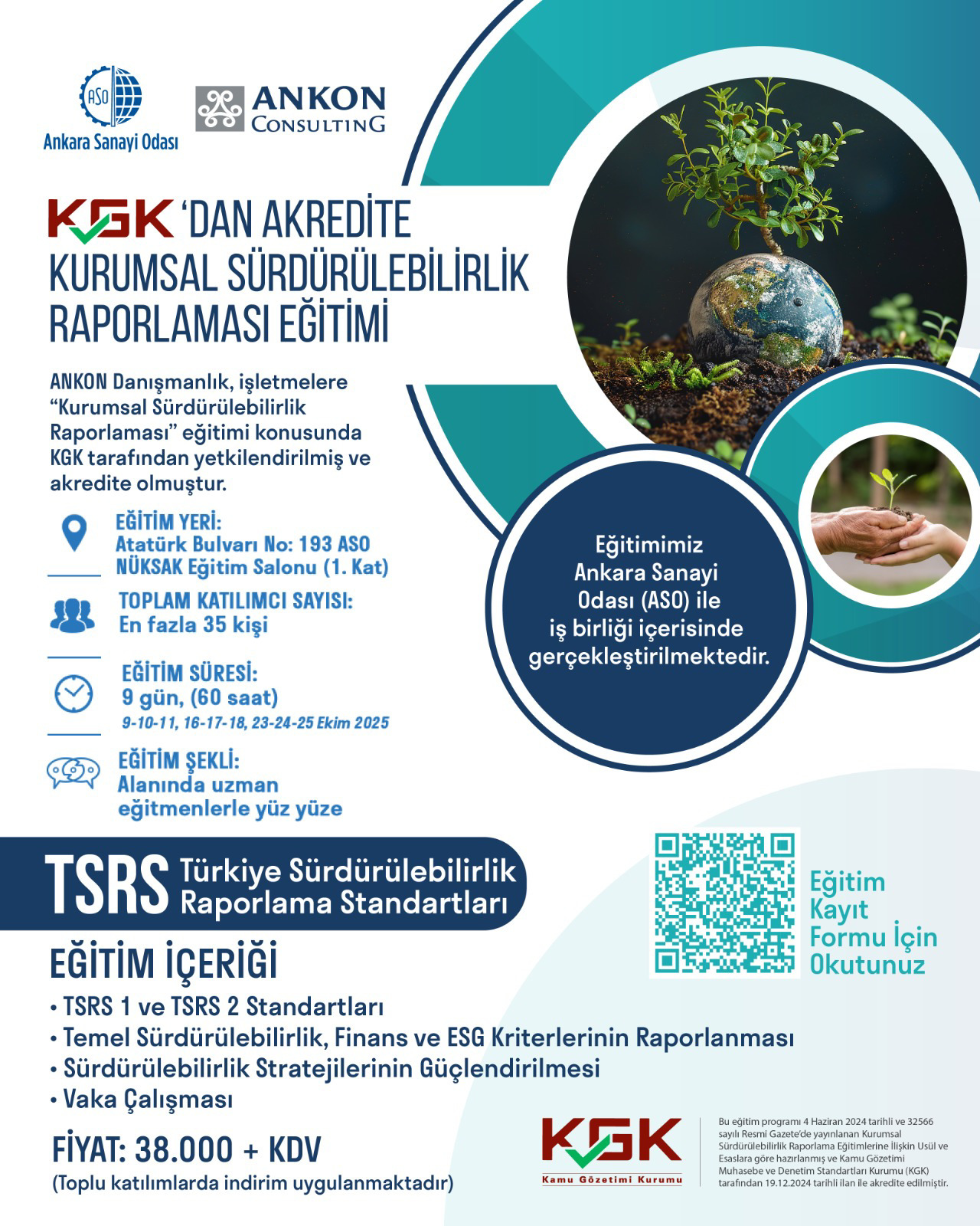 Ankara Sanayi Odası çevre ve iklim değişikliği konularında üyelerinin ulusal ve uluslararası zorunluluklara uyum kapasitesinin artırılması amacıyla Çevre ve İklim Değişikliği Müdürlüğünce farkındalık ve kapasite geliştirme faaliyetleri yürütmektedir. Bu kapsamda, Kamu Gözetimi Kurumu (KGK) tarafından akredite Ankon Danışmanlık ve Odamız işbirliğinde yeterli talep oluşması halinde “Kurumsal Sürdürülebilirlik Raporlama Eğitimi” düzenlenmesi planlanmaktadır. Ekte detayları yer alan eğitim Aso Nüksak Eğitim salonunda yüz yüze gerçekleştirilecek olup ; 9 tam gün olmak üzere toplam eğitim süresi 60 saattir. Eğitim ücreti Aso üyelerine %20 indirimli olup, eğitimi başarıyla tamamlayan katılımcılara KGK onaylı sertifika verilecektir. Eğitime katılmak isteyen firmaların 23 Eylül 2025 Salı günü Saat: 18:00’a kadar formu doldurmaları gerekmektedir.