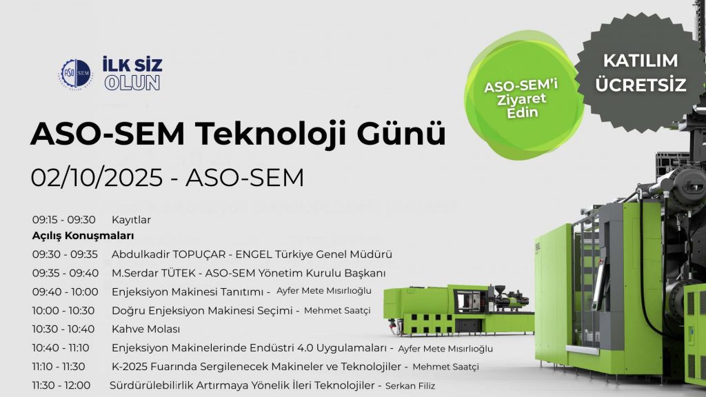 Bu kapsamda ASO-SEM Plastik Teknolojileri Atölyesine, dünyanın en ileri teknolojilerine sahip bir markayı tüm aksesuarları ile kursiyerlerimizin hizmetine sunan ENGEL, PİOVAN firmalarının işbirliğinde 02 Ekim 2025 tarihinde ASO-SEM’de “Teknoloji Günü” düzenlenecektir. Söz konusu etkinlikte; enjeksiyon makinesi tanıtımı, doğru enjeksiyon makinesi seçimine ilişkin esaslar, enjeksiyon makinelerinde Endüstri 4.0 uygulamaları K2025 fuarında sergilenecek yeni nesil teknolojiler, sürdürülebilirlik artırmaya yönelik konular hakkında katılımcılara kapsamlı bilgi aktarılacaktır.