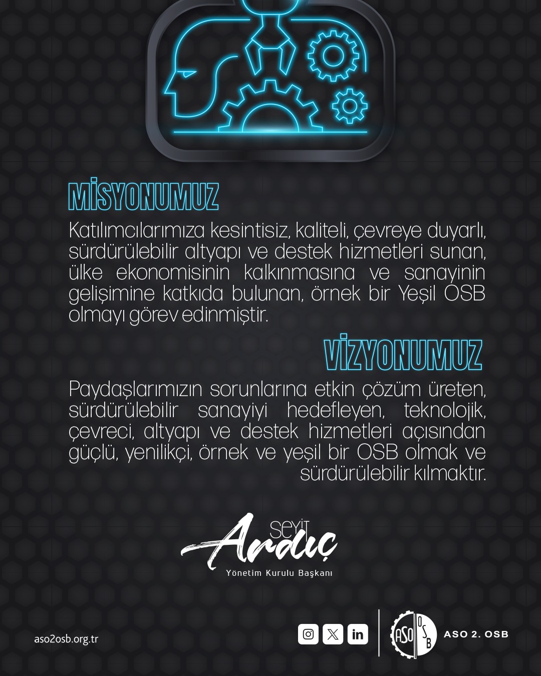 ASO 2 OSB’nin misyonu ve vizyonu; sürdürülebilir sanayi, çevreye duyarlı üretim, güçlü altyapı ve Ankara sanayisinin rekabet gücünü artırmaya yönelik stratejik hedefleri kapsamaktadır.