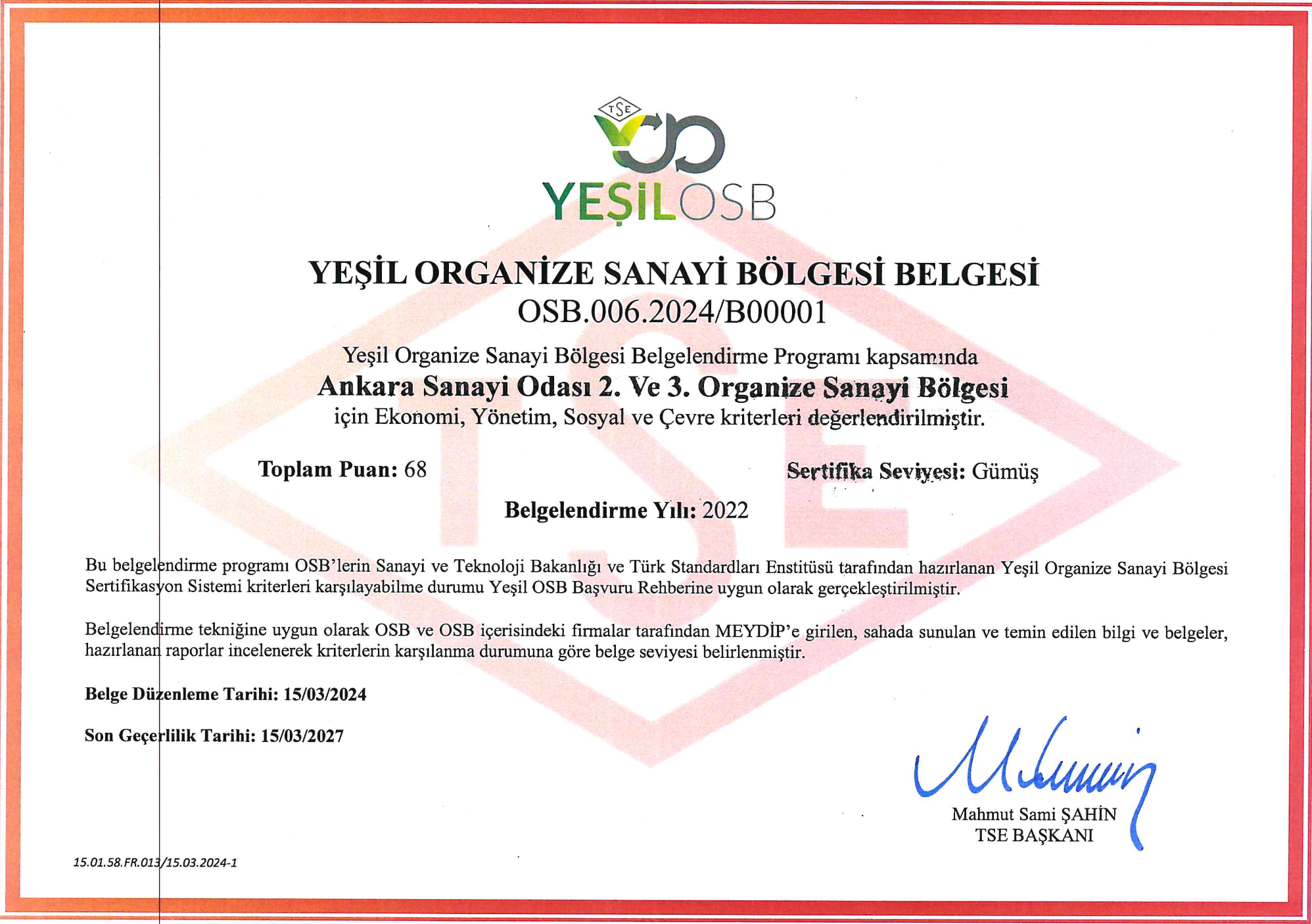 Yeşil OSB Belgemiz, çevreye duyarlı, sürdürülebilir ve kaynak verimliliğini esas alan sanayi anlayışımızı belgelemektedir.